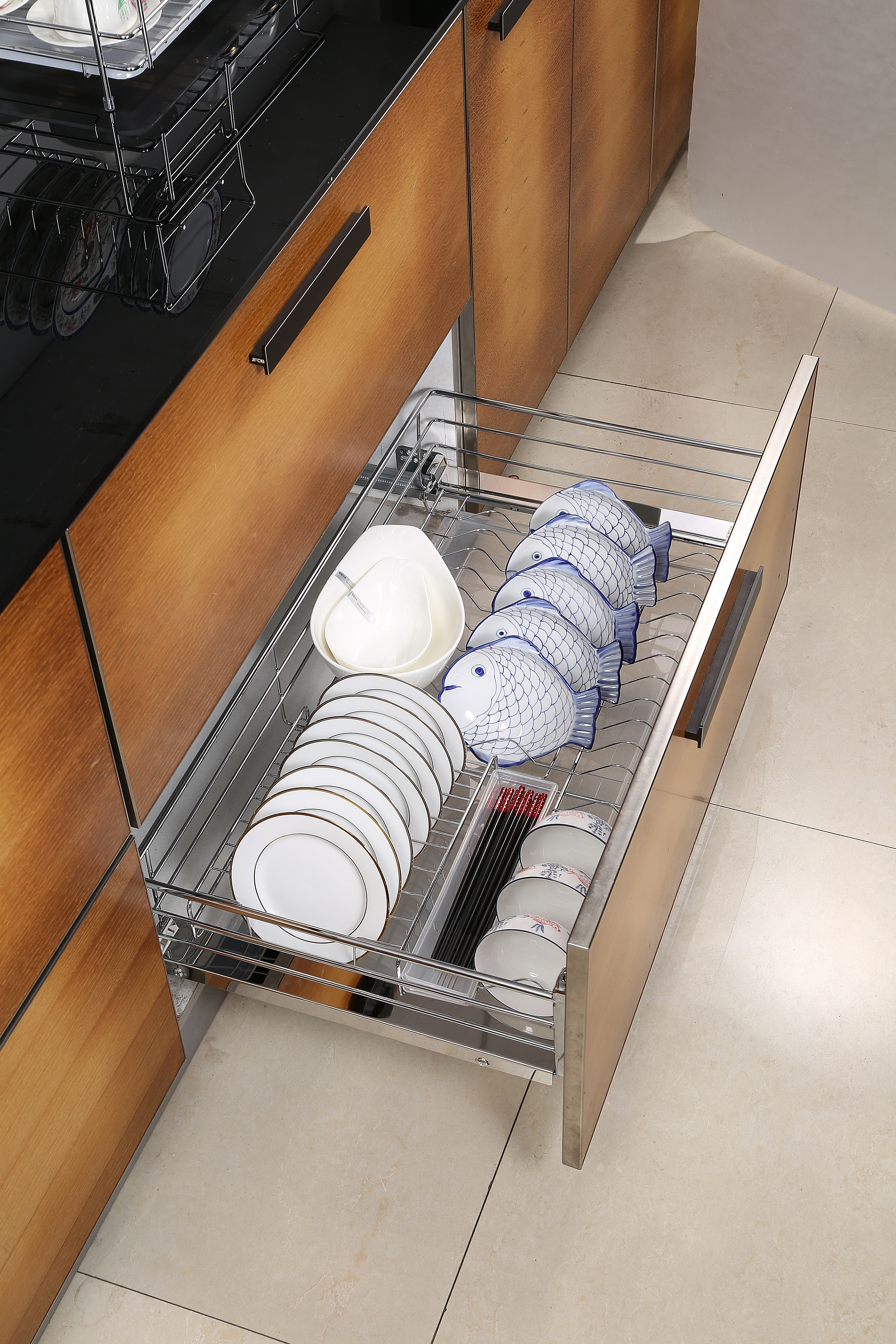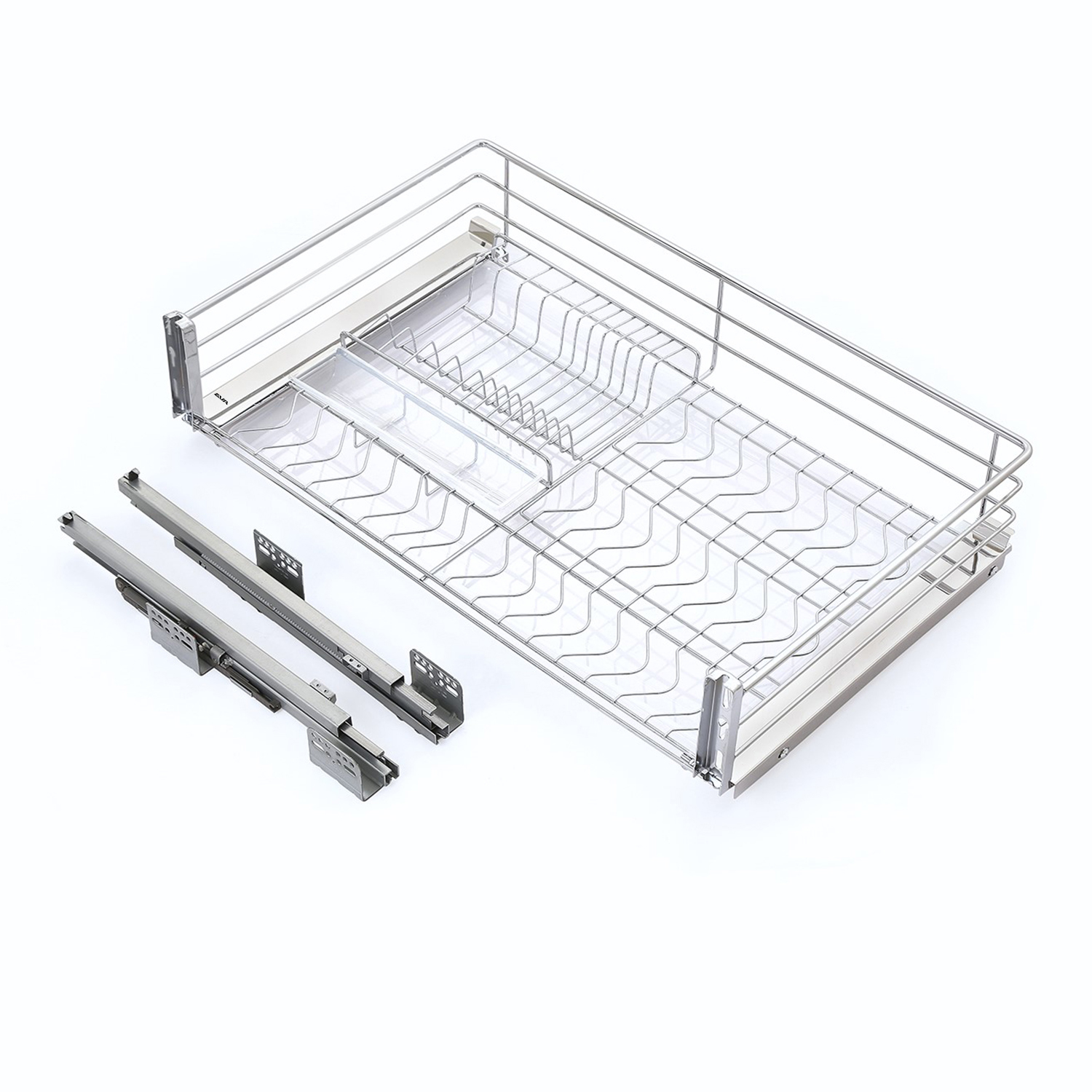 Организуйте идеальный порядок на кухне с выдвижной корзиной EVA Light Side. Конструкция посудосушителя продумана до мелочей: сетка с отдельными ячейками бережно и надежно фиксирует каждую тарелку, предотвращая соприкосновение и сколы. А просторное отделение предназначено для удобного размещения пиал, чашек, мисок и другой глубокой посуды. Поддон надежно защищает дно кухонной тумбы от сырости, предотвращая разбухание и деформацию. Ваша мебель останется в идеальном состоянии на долгие годы.