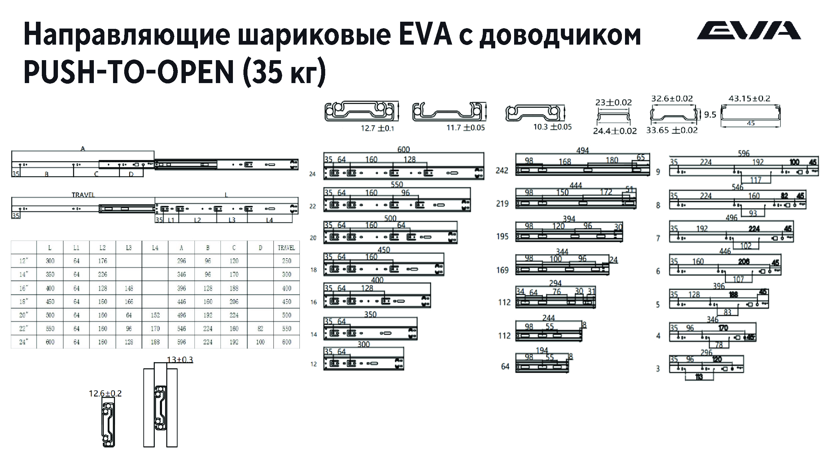 Мы производим шариковые направляющие только с «честной» высотой 45 мм и толщиной металла до 1,5 мм. Это позволяет добиться высокой грузоподьемности - до 35 кг.